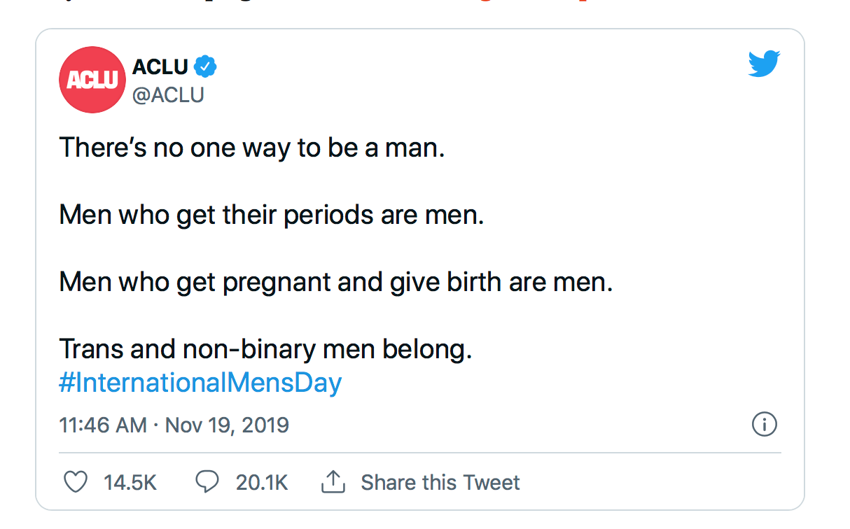 Now there is another form of ideological extremism being forced onto our boys: gender fluidity. We just passed International Men’s Day on November 19, which would have been a wonderful opportunity to discuss manhood. Instead the ACLU celebrated International Men’s Day with a campaign on how “men who get their periods are men.”