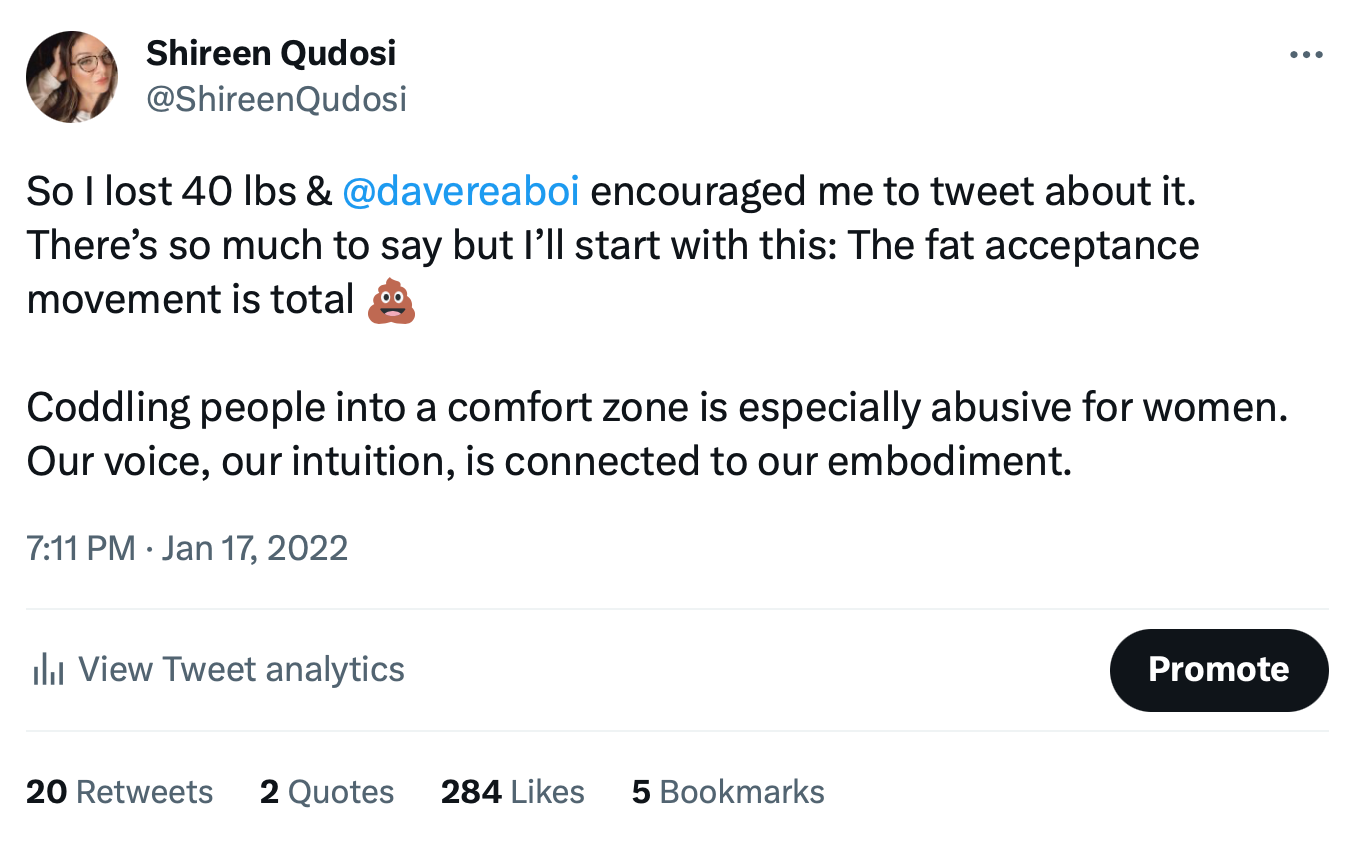 Now that I’ve shared my secret with you, you might understand when I say this: Please stop celebrating obesity through “fat-positive” campaigns. I put in a lot of work to lose enough excess weight to go down four sizes and gain a lot of strength and muscle. Those of us who have had to work really hard to change forms have some opinions that aren’t colored by brand endorsements or sponsors.