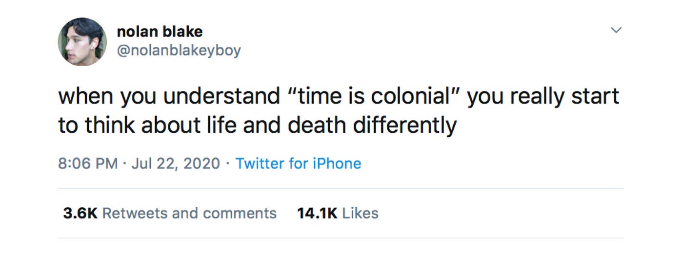 The idea that “time is colonial” is one example of punchlines with charged words that some with run with often thoughtlessly while others with challenge, often heartlessly.